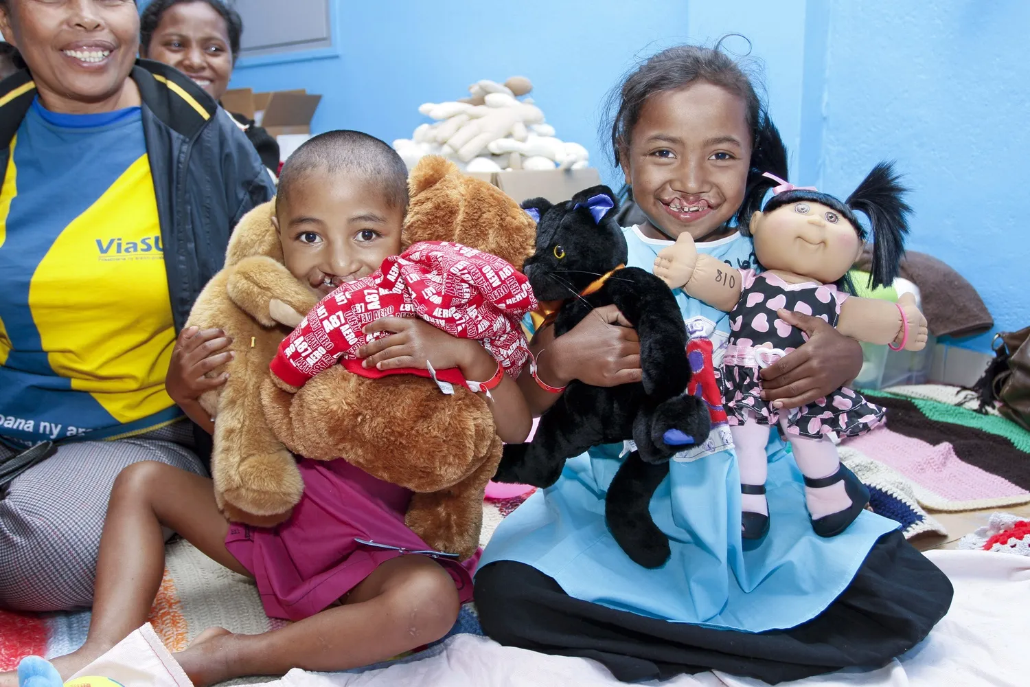 Cuando Donna y Priti llegan a los programas quirúrgicos de Operation Smile, lo más probable es que traigan una maleta llena de juguetes, suministros para actividades y materiales educativos para los pacientes, y explorarán el espacio asignado en busca de un espacio para convertirlo en un área de juego segura. Proporcionar actividades lúdicas durante las experiencias de atención médica es vital para prevenir traumas psicológicos a largo plazo en los niños.
