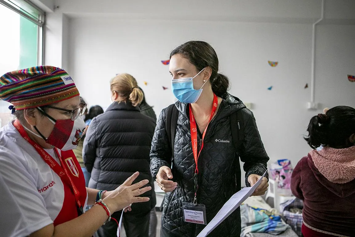 Atenas Bustamante, de Operation Smile Global Surgery, habla con una voluntaria durante un programa quirúrgico de Mujeres en Medicina en Lima, Perú. Fotografía: Manuela Emmer.