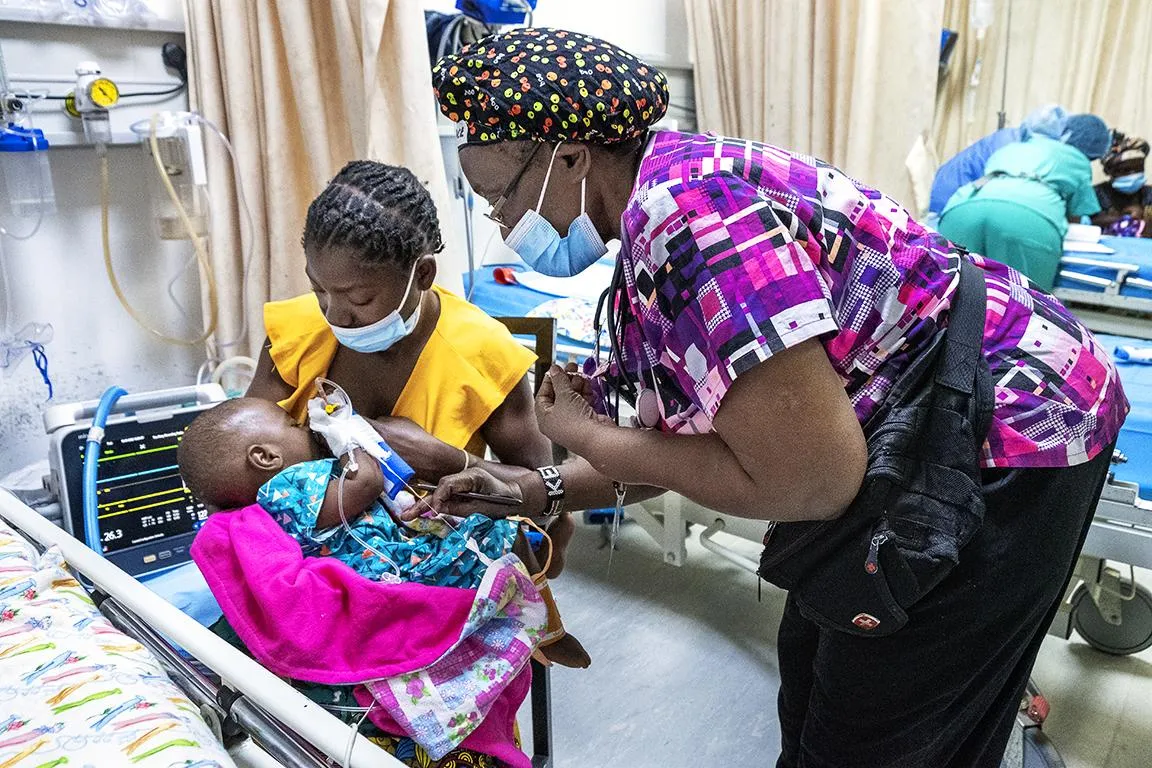 La enfermera voluntaria Florence Mangula de Kenia evalúa a David y su madre, Ireen, después de su cirugía durante un programa Mujeres en Medicina en Lilongwe, Malaui. Fotografía: Manuela Emmer.